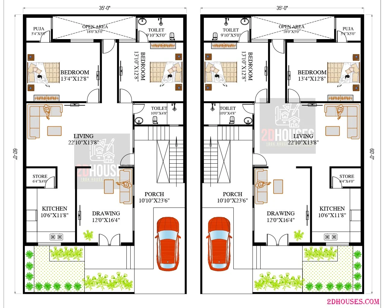 South-Facing 2-Bedroom 35x60 Feet House Design 2100 Sqft